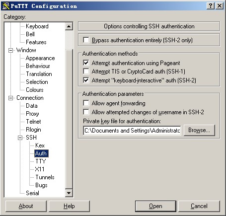 4)再设置putty选项,点窗口左侧的SSh –> Auth ,单击窗口右侧的Browse… 选择刚刚生成的私钥, 再点Open ,此时输入root,就不用输入密码就能登录了。