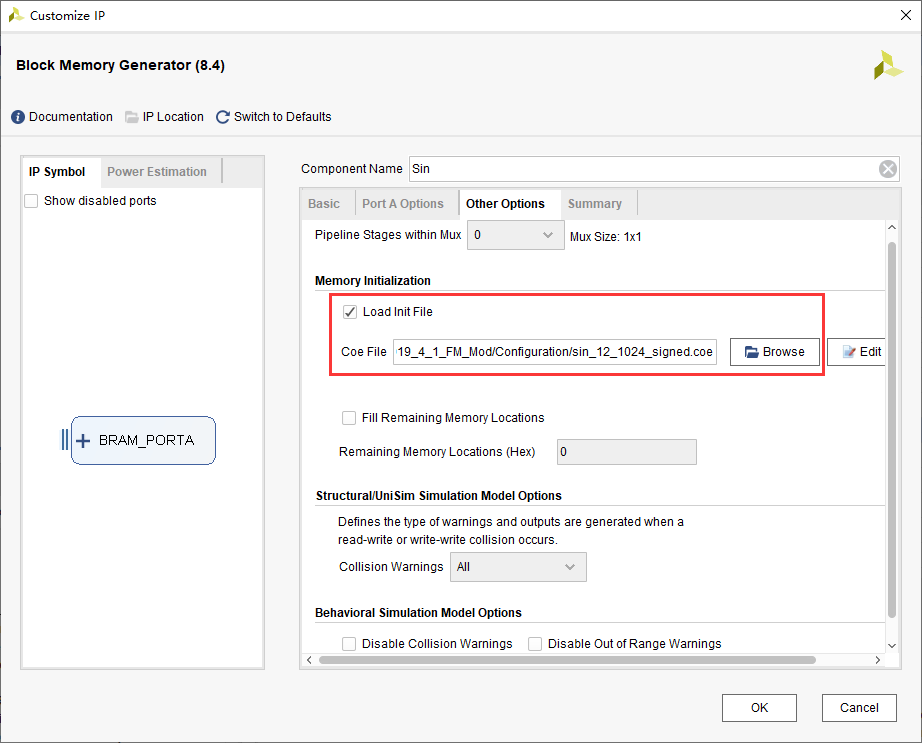其中只需要把位宽(改成12)和文件生成路径作相应修改即可。