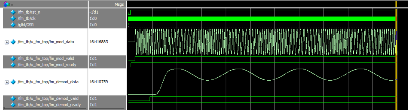 运行 Testbench 程序后,我们能得到下图波形数据。图中,fm_mod_data 是 FM 已调信号,我们能看到明显的疏密间隔;fm_demod_data 是解调后的信号(即原始消息信号),我们能明显观察到它的波形和上方的 FM 已调信号的疏密程度是一一对应的,说明了解调的正确性。