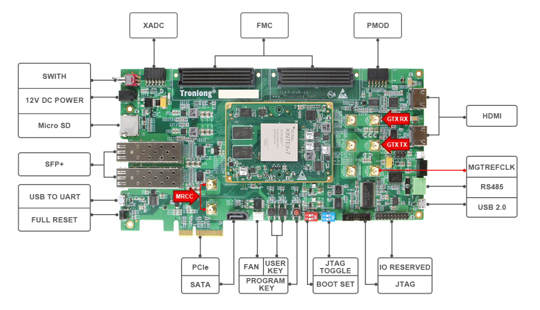 TLK7-EVM是一款基于Xilinx Kintex-7系列FPGA设计的高端评估板,由核心板和评估底板组成。核心板经过专业的PCB Layout和高低温测试验证,稳定可靠,可满足各种工业应用环境。