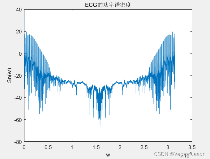 通过分析ECG功率谱密度:根据维纳-欣钦定理,对ECG自相关函数进行傅里叶变换即可得到功率谱密度。由图可知ECG的功率谱密度近似以w = 160K rad / s对称,且在低频,高频处数值更大。