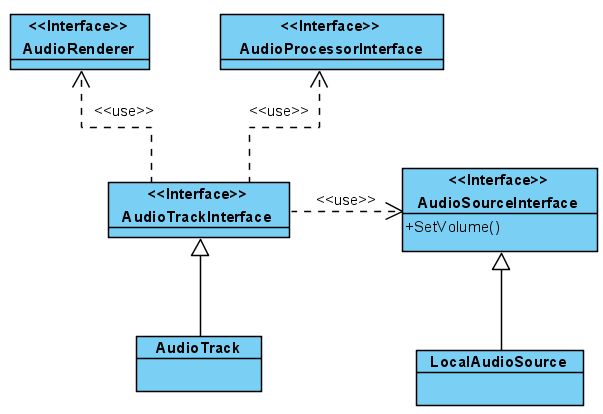 结构上看起来是不是和视频Track的结构类似?不过前面提过,如果你以对称的思维,在此结构中找出与视频track相似的采集源和输出源,那就肯定无功而返了,LocalAudioSource对AudioSourceInterface的实现就是一个空实现,没有了音频源,那音频处理接口AudioProcessorInterface和输出接口AudioRenderer都成了无米之炊了。