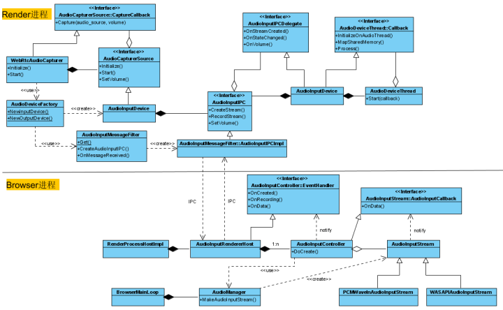 至于WebRtcAudioCapturer对象的持有者MediaStreamAudioSource和WebMediaStreamTrack,这里暂时有个概念就行,它们是Chromium对HTML5媒体流的实现接口。接下来仔细分析一下WebRtcAudioCapturer和WebRtcAudioRenderer两个关键类,毋庸置疑,它们都涉及到了特定平台实现,而且在Chromium中还跨越了Render和Browser进程。和介绍Chromium视频采集的模式一样,由于不是本文重点,这里只列出结构图,不打算详解,如果你有开发上的需要,可以照着该结构图细看源码。