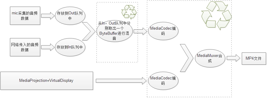 a) 视频数据采集使用MediaProjection+VirtualDisplay b) 双路音频的混音使用平均算法 c) 使用MediaCodec编码,使用MediaMuxer封装成MP4文件