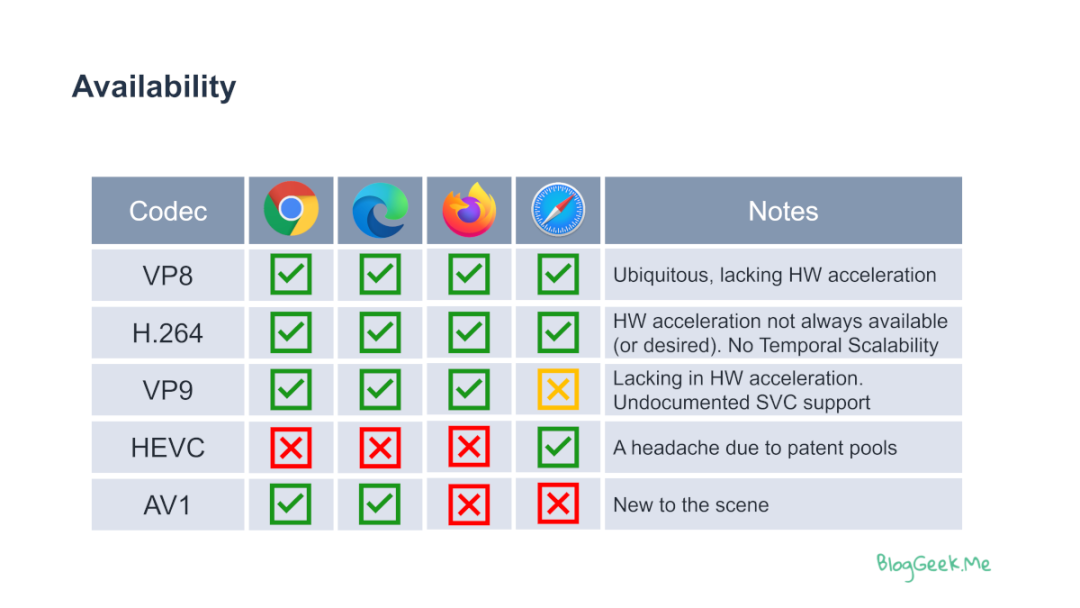 上图摘自我最近举办的2021年WebRTC趋势研讨会。它显示了web浏览器中对于支持视频编解码器当前的状态。