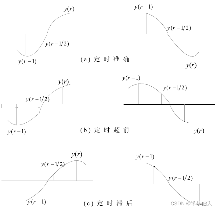 如图3所示,在码元类型发生变化时(比如从1 到 -1),如果采样时间没有偏差,中间采样点的值y(r-1/2),在时间平均上应该为0。若不为0,说明有采样偏差,其绝对值大小 |y(r-1/2)| 提供了采样偏差的大小,其正负符号 sign(y(r-1/2)) 只能提供一半的采样超前或者滞后的方位信息,无法区分图是3中(b或c)中码元由1到-1转变或者-1到1的转变。而y(r) - y(r-1)的差值提供了另一半的方位信息。两者结合就能区分图示3中(b)和(c)所示的4种情况。在实际工程中,也常用sign(y(r) - y(r-1))替代y(r) - y(r-1)。好处在于节省了乘法运算和规避了噪声对y(r) - y(r-1)的影响。
