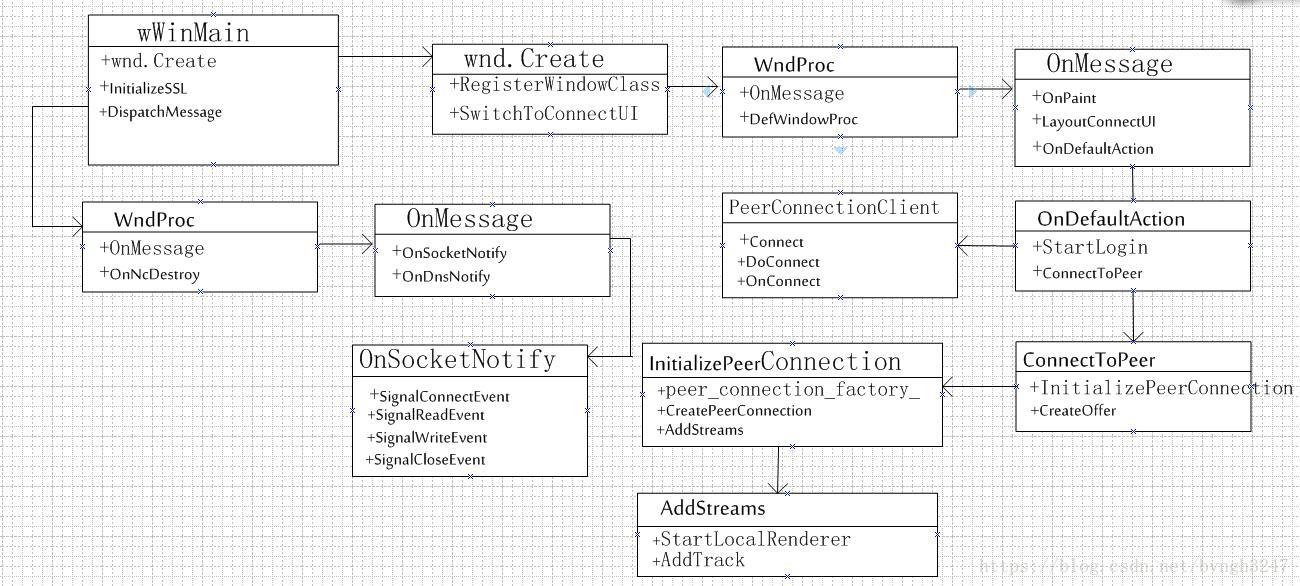 通过Win32Window::WndProc->OnSocketNotify->OnMessageFromPeer 表示收到远程的信息,其中会调用下面的OnAddStream等函数,被OnSocketNotify读函数调用,收到远程SDP等信息。
