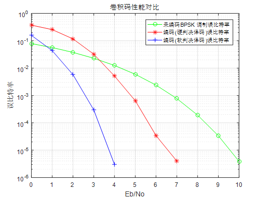随着信噪比的增大,不论有无使用卷积码编码,误比特率都在降低。但以(硬判决)维特比译码为例,对比之下,在大信噪比时(约大于3dB),有经过编码的误比特率较低;而在小信噪比时(约小于3dB),编码后的误比特率反而大于未编码时的误比特率。原因在于:在小信噪比情况下,编码的纠错能力超过了纠错门限以至于纠错码不再纠错,反而造成了更多的错误。
