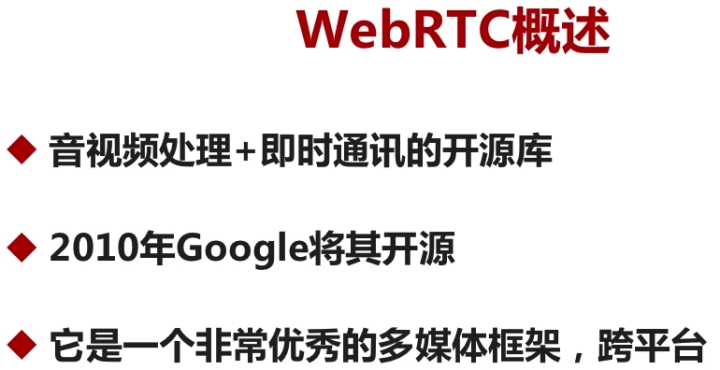 将WebRTC加入浏览器,使得浏览器的功能更加强大。WebRTC(Web Real-Time Communication)项目的最终目的主要是让Web开发者能够基于浏览器(ChromeFireFox...)轻易快捷开发出丰富的实时多媒体应用,而无需下载安装任何插件,Web开发者也无需关注多媒体的数字信号处理过程,只需编写简单的Javascript程序即可实现,W3C等组织正在制定Javascript 标准API,目前是WebRTC 1.0版本,Draft状态;另外WebRTC还希望能够建立一个多互联网浏览器间健壮的实时通信的平台,形成开发者与浏览器厂商良好的生态环境。同时,Google也希望和致力于让WebRTC的技术成为HTML5标准之一,可见Google布局之深远。