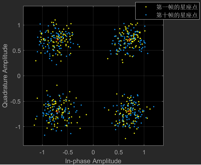 没有相偏和频偏的情况下,对比第一帧和第十帧的星座图可以看出星座点均敛。