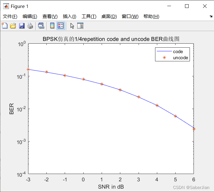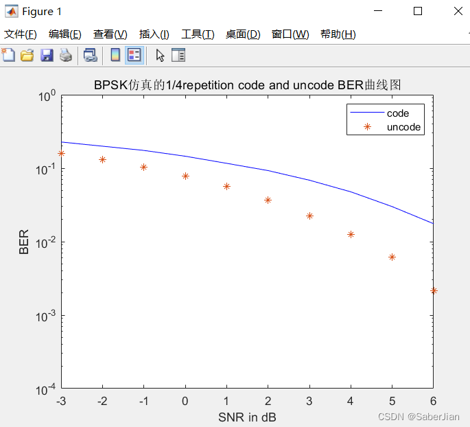 %% (1,4)重复码matlab的基带仿真,使用信道为高斯白噪声信道,使用的调制方式BPSK;