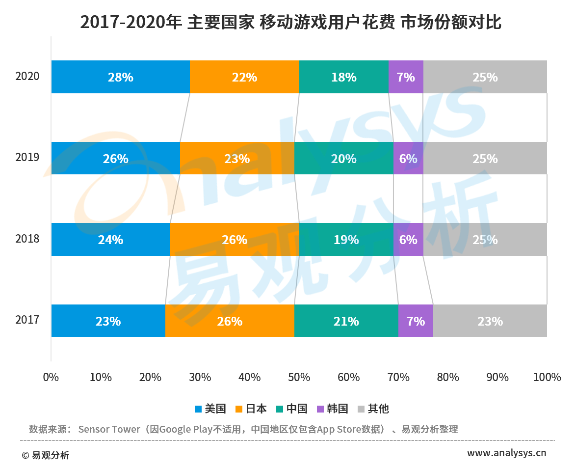 图 1-4 2017-2020年 主要国家移动游戏用户花费 市场份额对比
