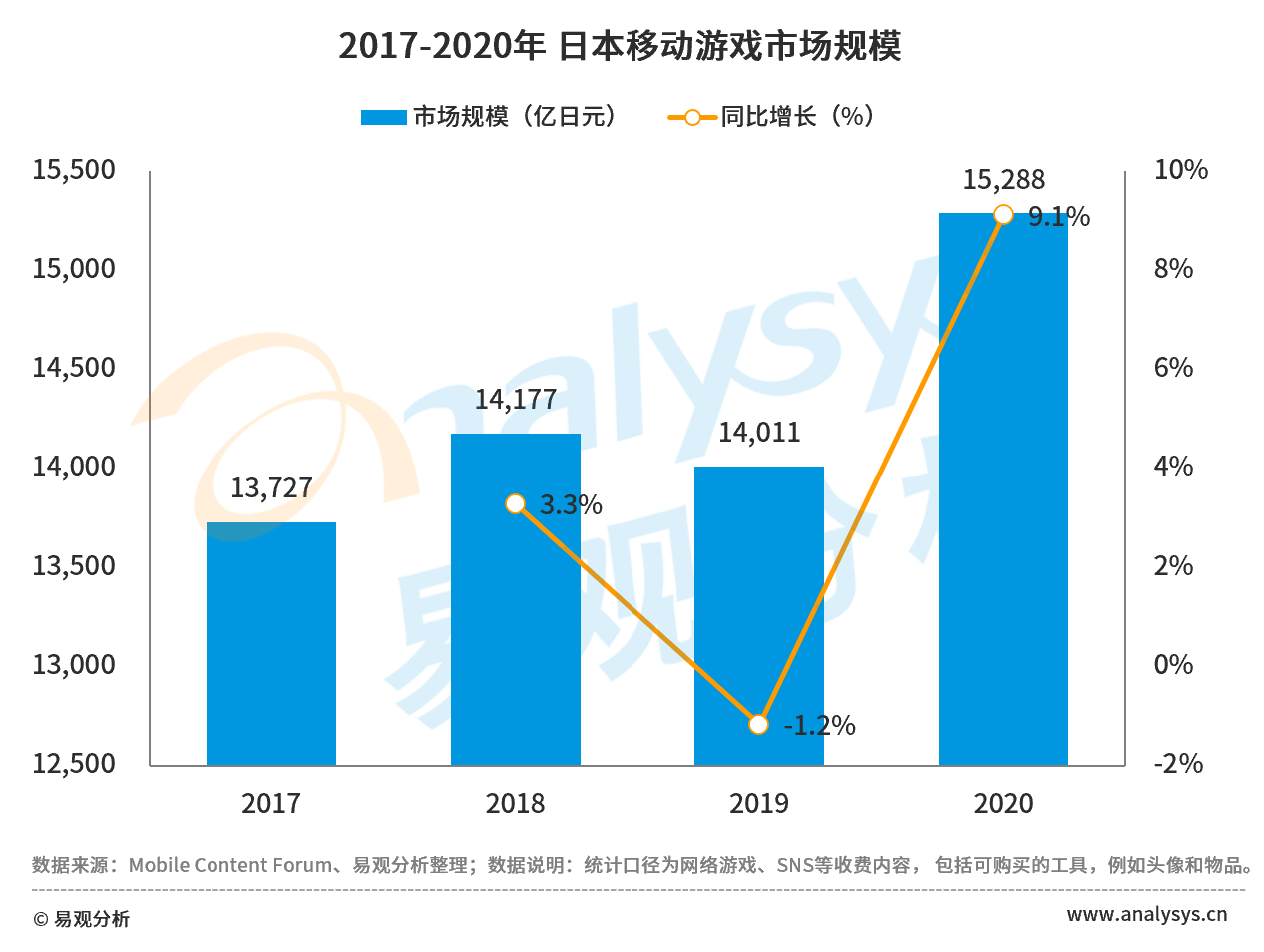 以日本市场为例,据Mobile Content Forum数据,2020年,日本移动游戏市场规模达15,288亿日元,同比略减1.8个百分点。在疫情等综合因素影响下,2020年日本移动端电子书、视频/娱乐市场收入均同比有所提升,分别达3,946、3,430亿日元。