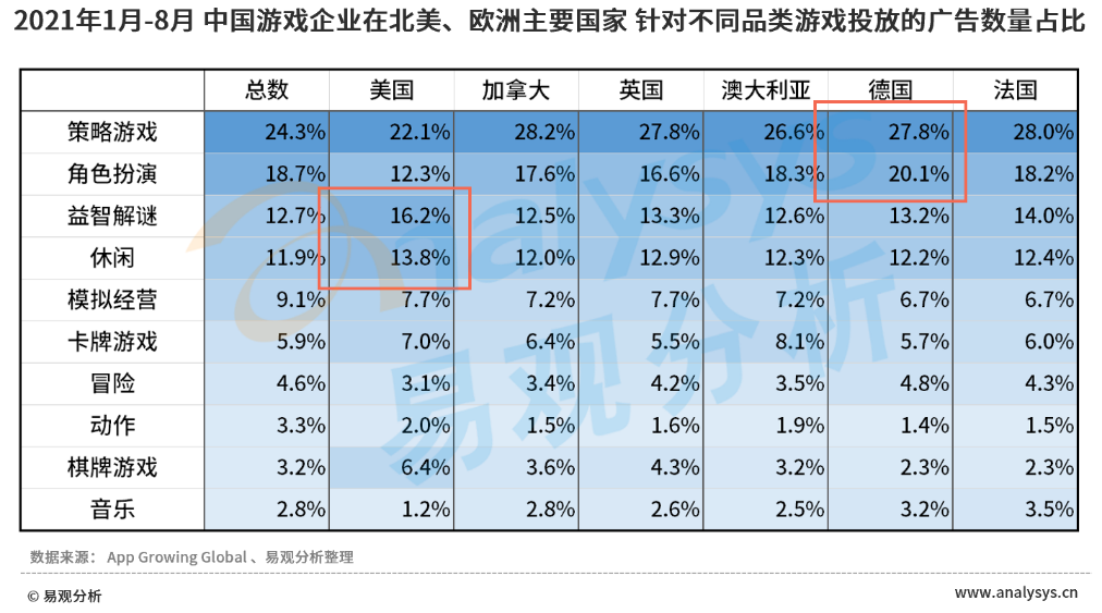 同样基于游戏品类层面,基于不同国家及地区玩家的游戏倾向和习惯,中国游戏企业对不同品类的投放倾向较为明显。首先,整体来看,中国游戏企业于北美、欧洲主要国家中投放的广告分布与总体差异性较小,策略、角色扮演类仍为主要品类,益智、休闲品类占比同样较高。