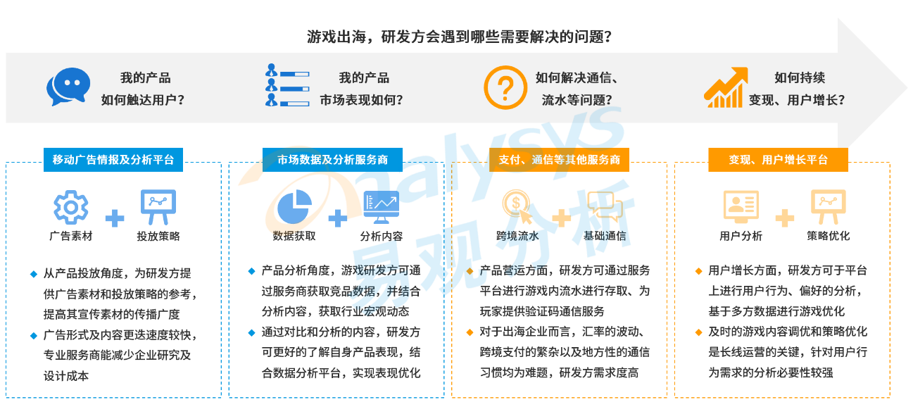 不同于国内的宣发模式,移动游戏于海外的发行往往需要面对众多阻碍。首先,部分研发商希望能够通过获取竞品市场表现数据和分析的方式,了解自身产品的竞争优势和增长潜力,从而具备一定的心理预期,并做好投放市场的选择。其次,游戏中玩家账号注册时需进行验证码发送,不同国家针对这一通信服务的合作模式均有一定差异;同时,游戏内玩家游戏充值均使用海外货币,汇率波动会对产品的流水产生影响。研发商需要解决上述这些游戏出海中面临的实质问题,保证产品顺利发行。