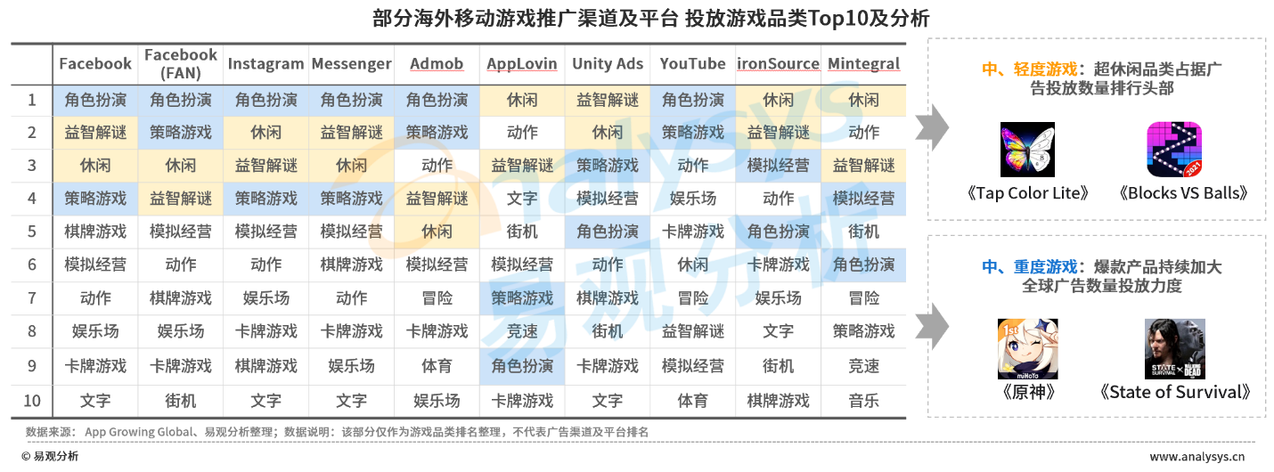 图 1-5 部分海外移动游戏推广渠道及平台 投放游戏品类Top10及分析