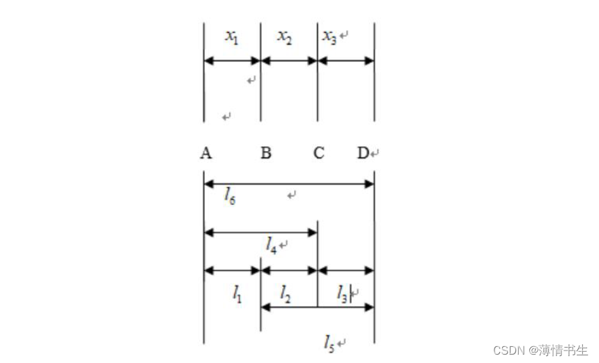 如下图所示已知直接测量刻线的各种组合量,要求检定刻线A、B、C、D间距离x1、x2、x3,测量数据的标准差以及估计量精度估计。