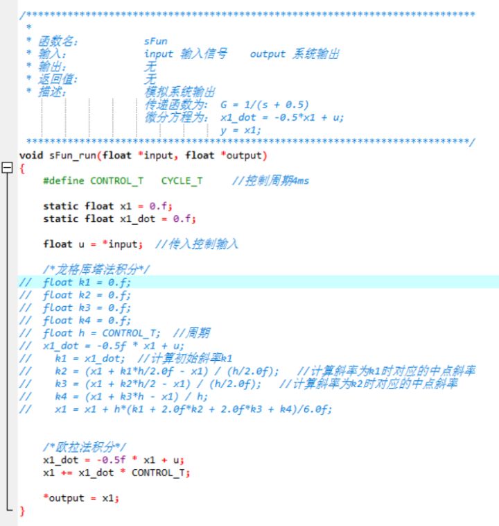 首先必然是需要先将算法代码给编写好,之后就可以模拟simulink中的积分环节。假设我们的控制对象为:G = 1 / (s + 0.5),那么我们就可以根据此传递函数转化为微分方程来进行C代码的编写。