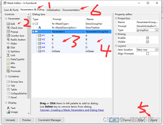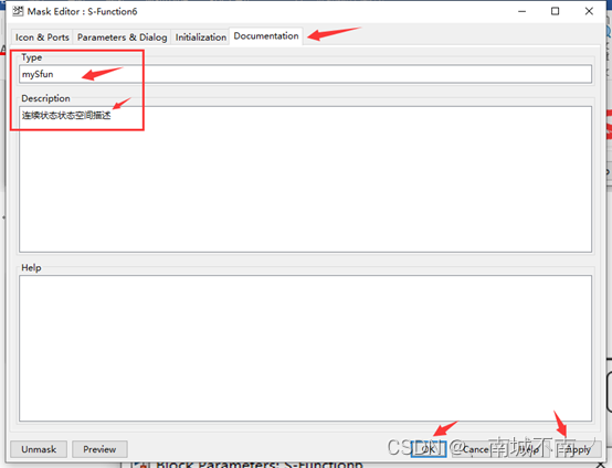 (6)对S-function模块进行封装。选择——菜单命令Diagrm——Mask——Create Mask,并编辑封装编辑器中的Parameters选项卡和Documentation选项卡。
