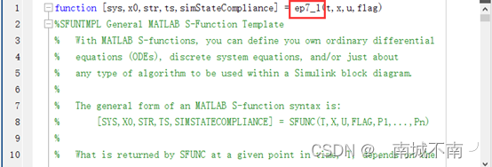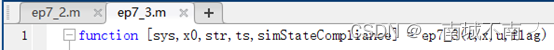 (1)将模板sfuntmpl.m另存为至ep7_6,并修改主函数名为ep7_6,添加参数A、B、C、D以及iniState。