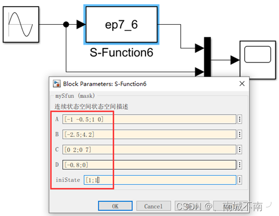 为了增强S-function模块的实用性,现要求系数矩阵A、B、C、D以及系统状态的初始值均可在参数对话框中设计。