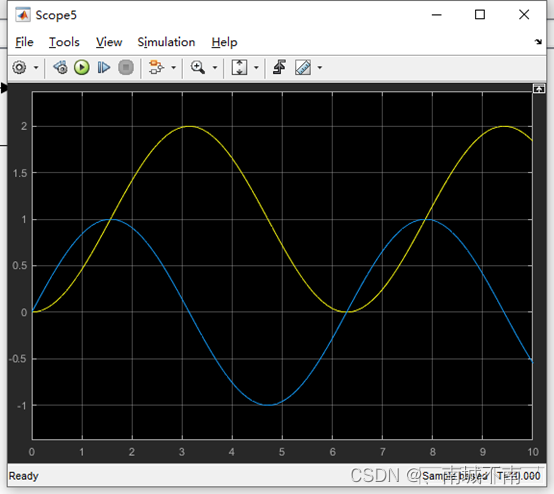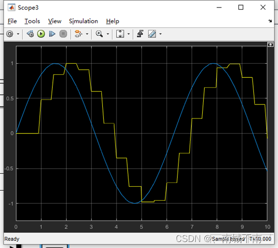 结论:蓝线为正弦信号,黄线为输出信号,可以看出正弦信号积分后,在经单位延迟离散采样的结果。