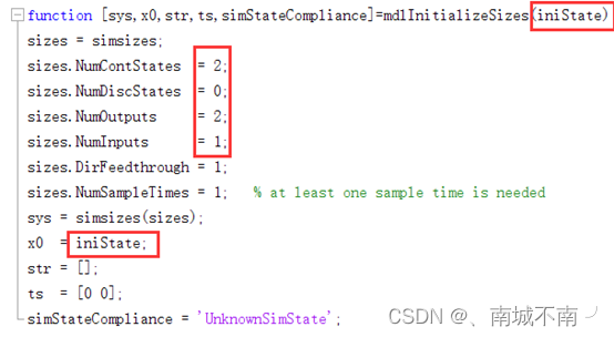 (2)调用初始化子函数时将参数iniState传递至mdlInitializeSizes子函数,状态导数和输出依赖于参数A,B,C,D以及iniState,因此需要对mdlInitializeSizes、mdlUpdate和mdlOutputs的调用做修改。