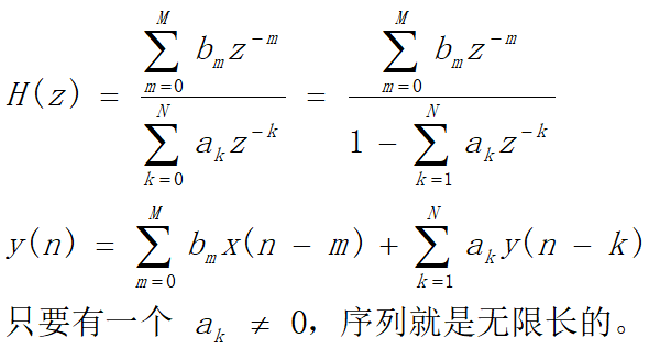 而IIR系统在求y(n)时需要用到以前的输出值y(n-k),因此在结构上有输出到输入的反馈,是“递归型”结构。