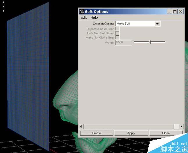 1、先建一个nurbs的平面,增加它的网格划分到一定的数目,本教程设置到了40,把它放在你的角色前面,在动力学菜单里,把它做成柔体。