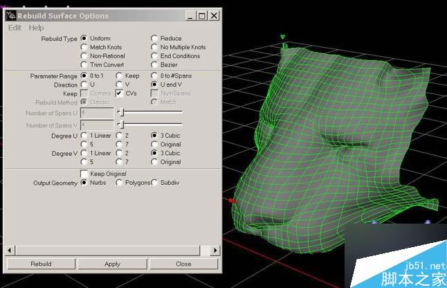 6、把多余的面切掉,重建曲面,主要是设置其参数为0-1,还有形状也不能变,按下图设置。