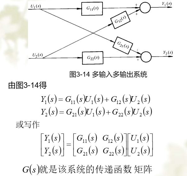 对于多输入—多输出的系统,要用传递函数矩阵去表征系统的输入与输出的关系,例如对于图3-14所示的系统。