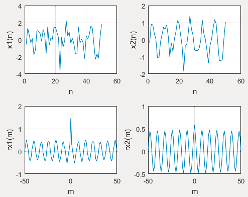 相关函数:研究两个信号的相似性,或者一个信号经过一段时间延迟后自身的相似性,以实现信号的检测、识别和提取。x(n),y(n)两个能量有限的确定信号,相关系数为: