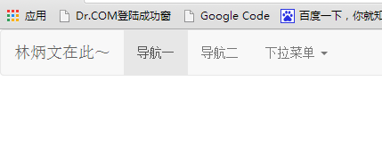 <!DOCTYPE html> <html> <head> <title>Bootstrap 实例 - 默认的导航栏</title> <link href="bootstrap.min.css" rel="stylesheet"> <script src="jquery-2.1.4.min.js"></script> <script src="bootstrap.min.js"></script> </head> <body> <nav class="navbar navbar-inverse" role="navigation"> <div class="navbar-header"> <a class="navbar-brand" href="#">林炳文在此~</a> </div> <div> <ul class="nav navbar-nav"> <li class="active"><a href="#">导航一</a></li> <li><a href="#">导航二</a></li> <li class="dropdown"> <a href="#" class="dropdown-toggle" data-toggle="dropdown"> 下拉菜单 <b class="caret"></b> </a> <ul class="dropdown-menu"> <li><a href="#">我是谁呢?</a></li> <li><a href="#">我也不知道</a></li> <li><a href="#">你是谁呢?</a></li> <li class="divider"></li> <li><a href="#">分离的链接</a></li> <li class="divider"></li> <li><a href="#">另一个分离的链接</a></li> </ul> </li> </ul> </div> </nav> </body> </html>