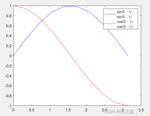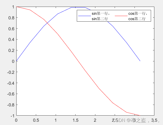 legend(['sin第一行,' newline 'sin第二行'],['cos第一行,' newline 'cos第二行']);