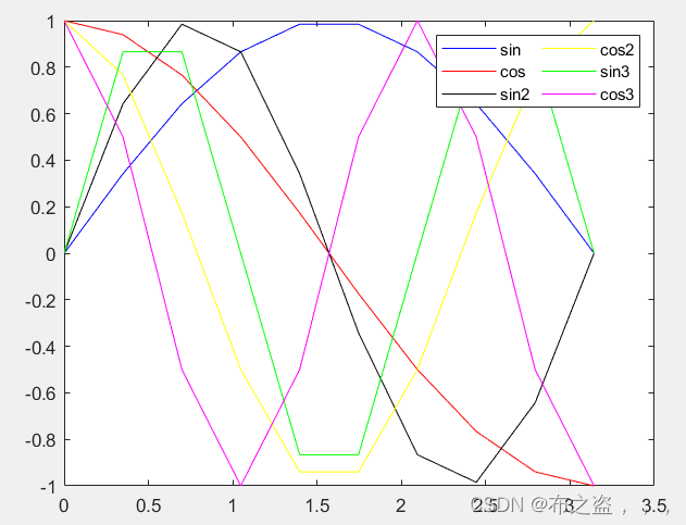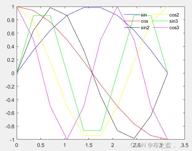 legend('sin','cos','sin2','cos2','sin3','cos3','NumColumns',2);