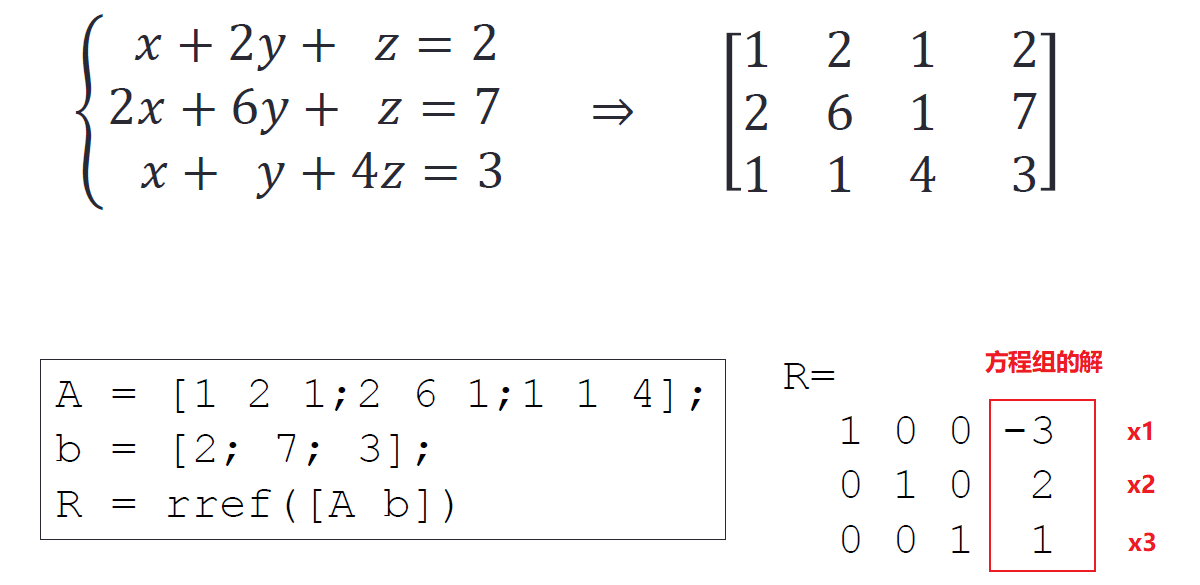 对增广矩阵 [A b] 使用rref()则可以求解 Ax=b 对应的线性方程组