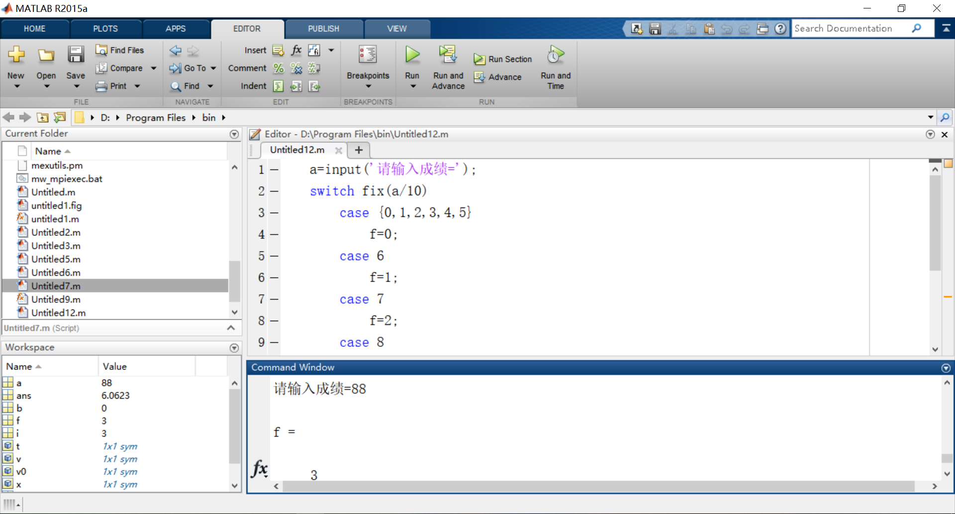 编写一个自动判定成绩等级的函数文件,当输入的成绩在[0,60)之间时返回0,[60,70)之间返回1,[70,80)之间返回2,[80,90)之间返回3,[90,100]之间返回4。