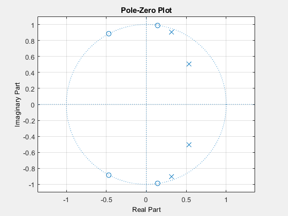 可视化滤波器的零相响应。覆盖单位圆,极点和零位。