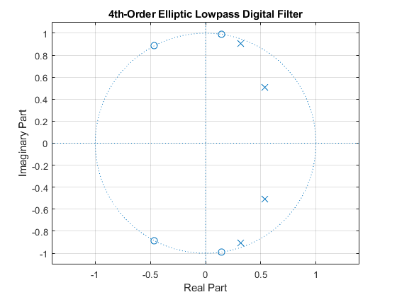 使用创建相同的过滤器designfilt。使用zplane绘制极点和零点。注意zplanecall的这种语法fvtool。