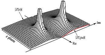 如果我们绘制|Z(s)|相对于s的幅度曲线,则可以直观理解零点和极点的含义。所得到的曲线就好像在s平面上竖起的帐篷,在零点处接触s平面,而在极点处其高度变为无限。