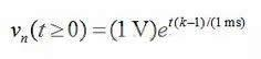 在图5a的电路中,由vn表示的节点和地之间的阻抗为Z(s)=R||(1/sC)=R/(1+sRC),因此在s=-1/(RC)=-1/(1ms)时电路具有一个极点。假设vn(0)=1V,我们可以得到: