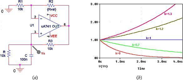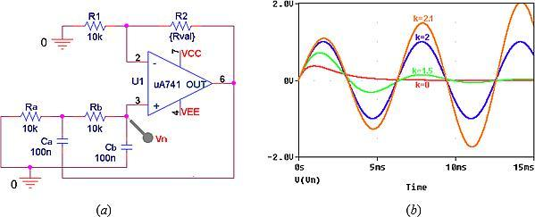 ●将k提高到2以上,使运算放大器注入的能量超过端口电阻可以消耗的能量,引起发散振荡,如图9b中k=2.1所示。振荡将持续增长到运算放大器饱和为止。