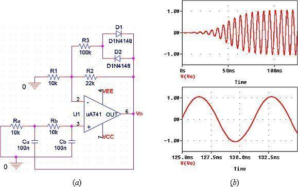 在图11a中,电源接通时,两个二极管仍然关闭,因此k=R2/R1=22/10=2.2,表明振荡增加。随着振荡的增加,二极管在交替的半周期内逐渐导通,所以k=[R2||(R3+rd)]/R1,其中rd是动态二极管电阻(rd随二极管电流而减小)。在rd《R3的极限情况下,我们将得到k=(22||100)/10=1.8,表示电路可在1.8<k<2.2的范围内调整k的值,这包括k=2.0时持续振荡达到所需幅度的情况。
