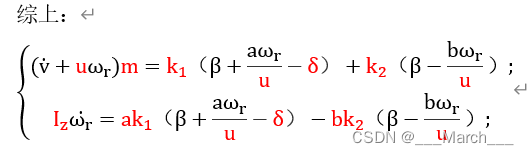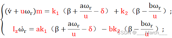 二自由度车辆模型中的二自由度指的是车辆的横摆和侧向运动,这里的侧向运动指的是车辆的质心侧偏角或者侧向速度表示。二自由度车辆模型经过推导之后,可表达为下面两个等式: