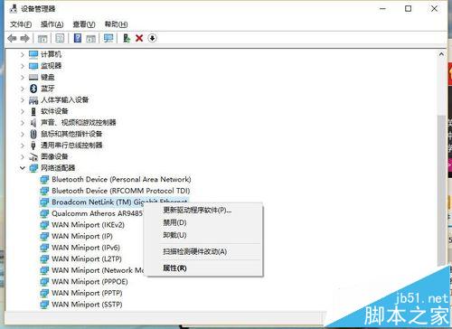 3、在设备管理器窗口中找到”网络适配器“,右键选择Broadcom...Gigabit Ethernet,点击”“更新驱动程序。
