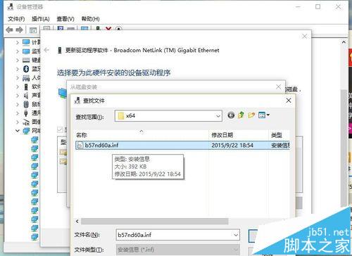 5、点击”从磁盘安装“,选择浏览,找到下载解压的驱动位置,我的64位系统,所以选择的X64,双击b57nd60a.inf文件,如图。