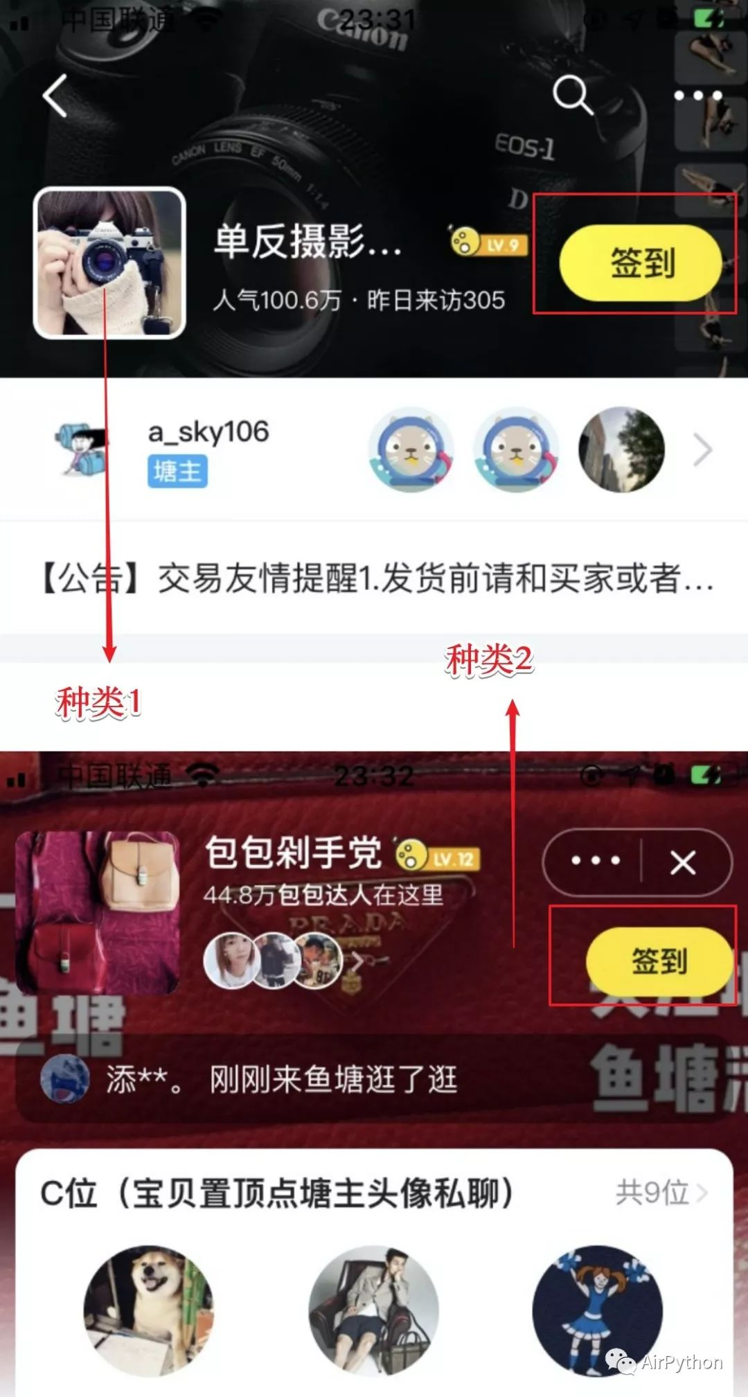 通过观察,发现鱼塘签到界面有 2 种类型,即签到按钮的样式不一样、返回方式也不一样。签到界面内,签到按钮控件是一张图片元素,没法利用传统的文本方式获取控件。