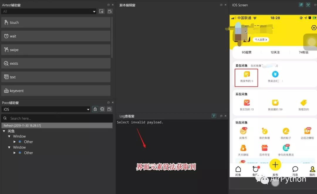 首先,点击最后一个 Tab,进入到我的页面。利用 AirtestIDE 尝试去捕获元素,但是会报错:Select invalid payload,这个问题可能是 iOS-Tagent 现有的 Bug,这里换一种方式,使用点击屏幕坐标的方式跳转到商品发表页面。