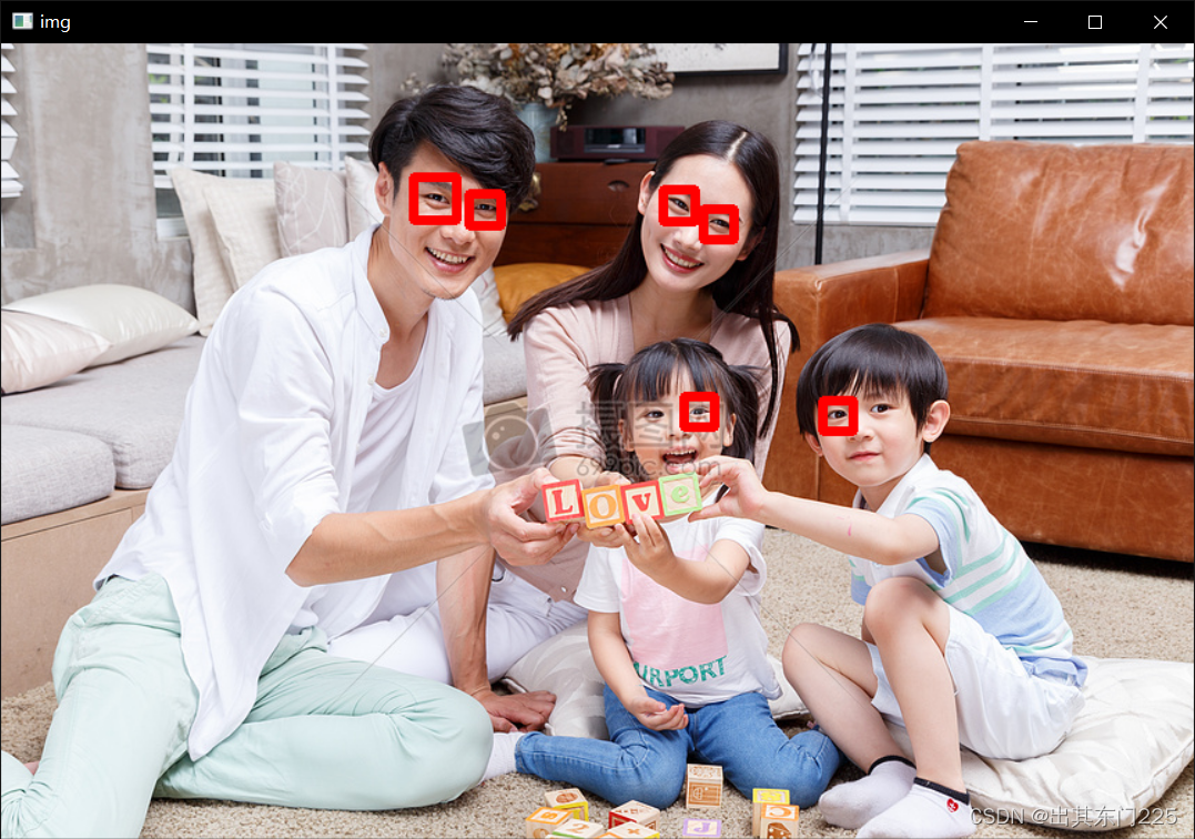 haarcascade_eye.xml 文件放到项目根目录下的 cascades 文件夹中,加载此级联分类器之后,检测出所有可能是眼睛的区域,通过 for 循环在这些区域上绘制红色边框,具体代码如下