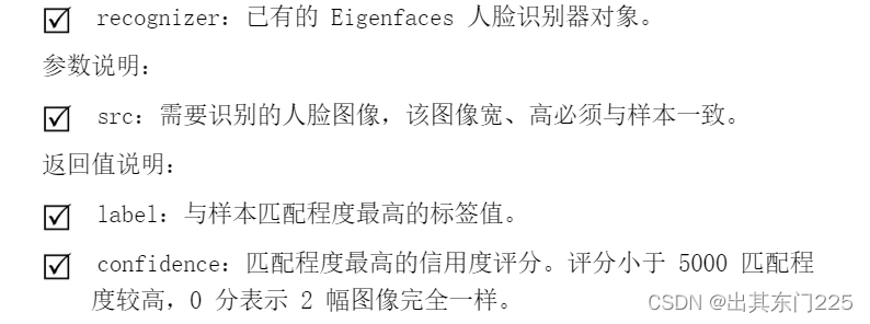(1)通过 cv2.face.EigenFaceRecognizer_create()方法创建 Eigenfaces 人脸识别器,其语法如下: